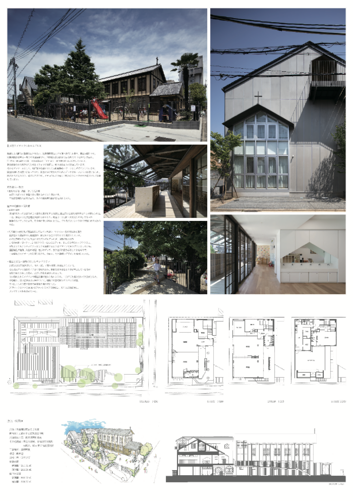 | 作品説明 | 建替による園舎の耐震化に伴い、幼稚園型認定こども園へ移行した園舎、園庭の設計です。国登録有形文化財である「礼拝堂」があり、「中京区・区民誇りの木」である雌雄の「イチョウ」が園庭の中央に位置しています。園舎は礼拝堂や聖書に出てくる動植物をモチーフとしてデザイン。園庭には広さに限りがあったので、園舎とひと続きの「だんだんデッキ」を設けました。園児たちが走り回り、遊ぶことができ、イチョウにより近くで触れ合うことができる遊具として活躍しています。 |