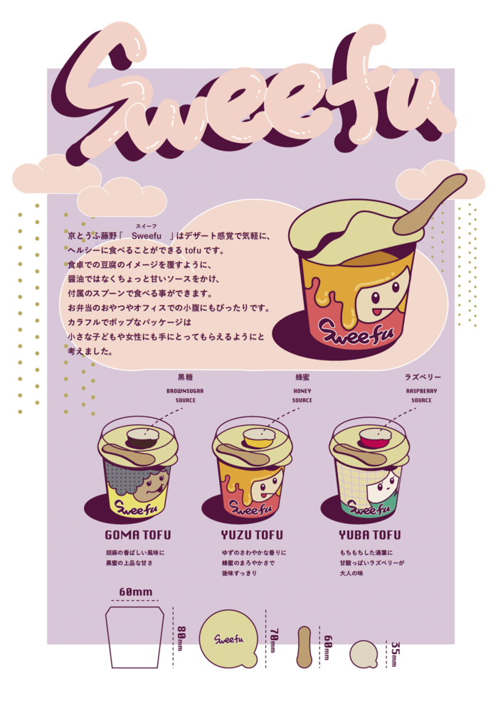 | 作品説明 | この作品のコンセプトが デザート感覚で食べられるとうふです。甘いソースをかけてスプーンで食べるSweefuは、こんな食べ物があったらいいなという思いから着想しました。食卓に出る豆腐とは別の新たな商品として考えました。 |