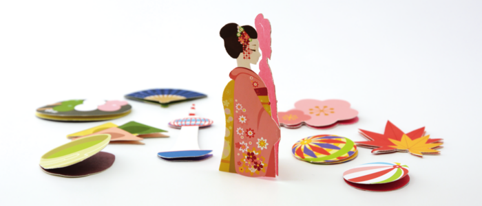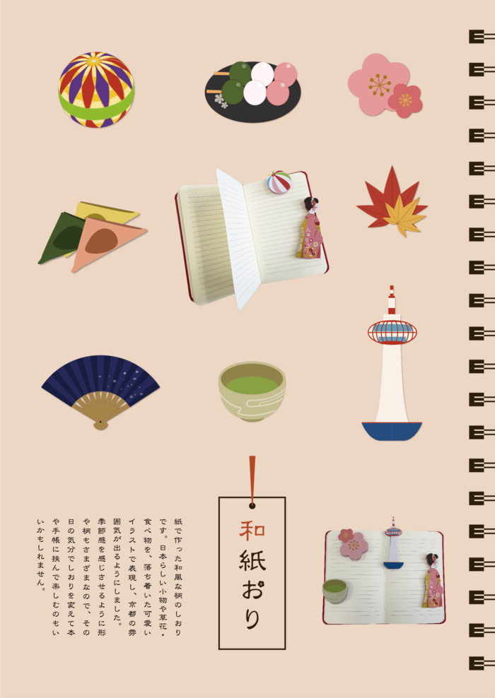 | 作品説明 | 日本らしさを感じさせる小物、草花、食べ物などを落ち着いた可愛いイラストで表現し、京都の雰囲気を出した和風なしおりを作りました。柄は全部で十種類あり、その日の気分でしおりを変えて本などに挟んで楽しむこともできます。 |