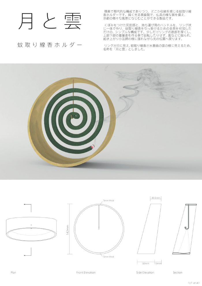 | 作品説明 | 簡素で現代的な構成でありつつ、どこか伝統を感じる蚊取り線香ホルダーです。鈍く光る真鍮製で、仏具の様な質を備え、京都の様々な風景になじむことができる製品です。 くぼみをつけた灰皿部と、持ち運び用のハンドルを、リング状に一体で作り、蚊取り線香を引っ掛けるための金具を付加しただけの、シンプルな構成です。 少しだけリングの底部を厚くし、上部下部の重量差を作る事で回転したりせず、風などに揺られ、起き上がり小法師の様に揺れながら元の位置へ戻ります。 リングが月に見え、蚊取り線香が水墨画の雲の様に見えるため、名称を「月と雲」としました。 |