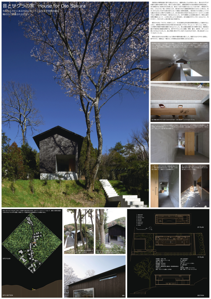 | 作品説明 | 鳥のさえずりが反響する静かな場所。こだまする音の流れをひと繋がりの重量のある空間で受けとめ、木戸の開閉、筒状・袋状空間によって「音」を捉え楽しむ。既存の「サクラ」を残し時間的環境として継承、傾斜地の特性を引き出す奥行きのある長いアプローチで歩くことを誘発し、この場所の環境や地勢を堪能する。 |