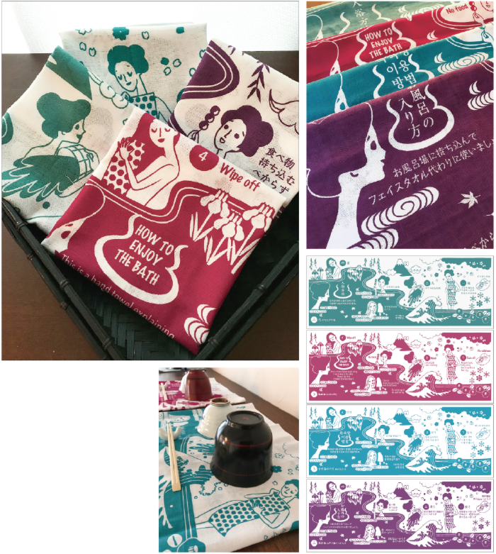 | 作品説明 | 増え続ける外国人観光客の入浴マナー対策のための手ぬぐいです。お風呂の入り方をわかりやすくイラストと簡単な言葉で表現。それぞれの国の人々がお風呂場で手元で確認できるようプロの翻訳家に依頼して、中国語・英語・韓国語・日本語の4種類をご用意し、京都の染物屋さんで手ぬぐいに仕上げてもらっています。 |