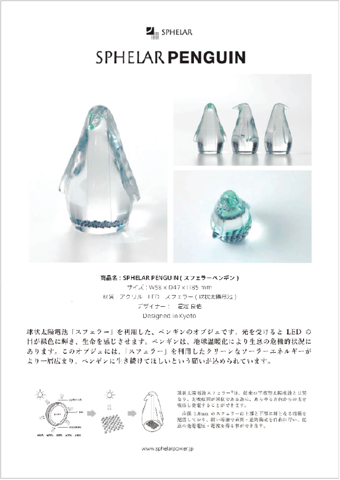 | 作品説明 | 球状太陽電池「スフェラー」を利用した、ペンギンのオブジェです。光を受けるとLED の目が緑色に輝き、生命を感じさせます。ペンギンは、地球温暖化により生息の危機的状況にあります。このオブジェには、「スフェラー」を利用したクリーンなソーラーエネルギーがより一層広まり、ペンギンに生き続けてほしいという願いが込められています。 |