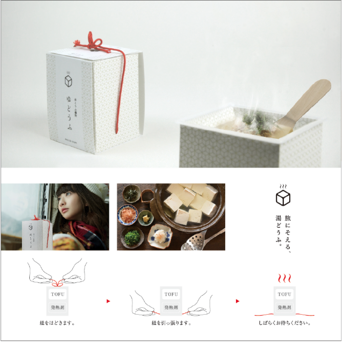 | 作品説明 | 「旅にそえる、湯どうふ」は京都の郷土料理である湯豆腐を手軽に持ち帰れるパッケージです。このパッケージは二層構造になっており、下段には発熱剤が入っています。開封時にほどいた紐を引っ張ることで、どんな場所でも温かい湯とうふが楽しめます。 |