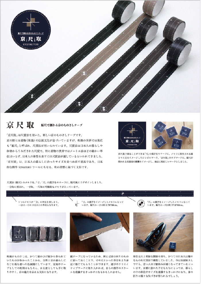 | 作品説明 | 「京尺取」は尺貫法を用いた、新しい京のものさしテープです。京の街に馴染みの深い和裁の世界では現在も「鯨尺」と呼ばれ、尺貫法が用いられています。日本人の暮らしや体格からうみだされた尺度である鯨尺をリデザインし、様々な物に貼ってものさしにすることで、身の回りの単位を見つめなおす創作ツールになります。 |