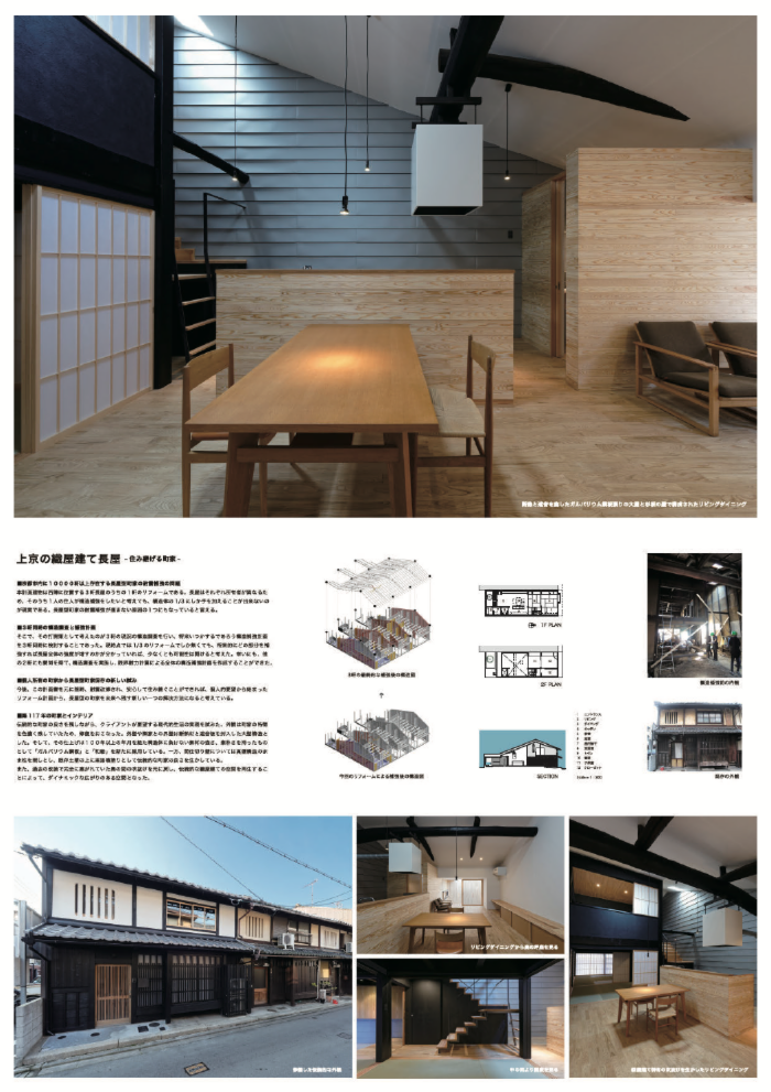 | 作品説明 | 築117年、3軒長屋のうちの1軒のリフォームである。1軒の依頼ではあったが、3軒分の構造補強計画を作成することによって、今後、これを元に随時他の2軒の耐震改修が行われれば、所有者が異なる長屋であっても安心して住み継ぐことができ、未来の京都に長屋型の京町家を残していけるのではないかと考えた。 |