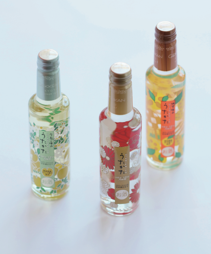 | 作品説明 | 「うたかた」(泡沫)は水面に浮かぶ泡を意味しており、炭酸入りの飲み物であることをイメージして名付けられた商品。「和」をモチーフにしたデザインコンセプトで、SOU・SOUの人気柄「金襴緞子」など華やかな柄で透明瓶を彩っています。まるで着物を着せたような艶やかなデザインで、お召し上がりの後は、一輪ざしとしてもご活用いただけます。 |