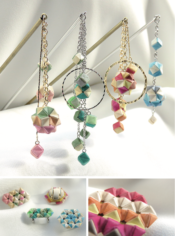 | 作品説明 | origami 〜古都の星〜は和紙の折り紙アクセサリーです。 着物、手漉き和紙、折り紙…、どれも現代の日本では悲しくも廃れていっている文化です。 そこで、私は「気軽に和を楽しむ」をコンセプトとしたピアス、帯留、そしてかんざしを提案します。すべて職人による手漉き和紙を使用しており、技法は薗部式ユニット折り紙のアレンジです。 (くす玉のように、同じパーツをいくつも折り、枚数や組み合わせにより様々な形を作る技法) 1cm〜1.2cm角の紙を6枚から、最大30枚組み合わせ形作り、強度を上げつつ紙の質感を極力残せるよう、ツヤの無いマットな樹脂でコーティングしています。 色は、一年を通して着物の種類があるように、京都の一年に含まれる四季をイメージしています。 日常の中で「身につける」ことが、伝統に興味を持つ懸け橋になることを願っています。 |