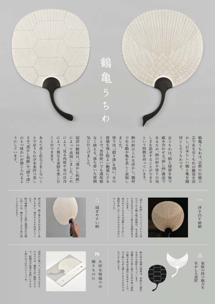 | 作品説明 | 鶴亀うちわは、京都の伝統工芸である京うちわの構造を活かし、日本らしい鶴と亀を題材にしたうちわです。 柄は「摺り漆」によって木の質感を残し、程よい艶感にすることで、普段使いでも違和感のない落ち着いた雰囲気にしました。扇部の模様は「透かし和紙」によって表現し、見る角度や光の具合によって変化する表情を楽しめるようにしています。あえて差し色をせず、京うちわが本来持つ美しさや「透かし和紙」や「摺り漆」の持つ味わいを大事にしました。 |