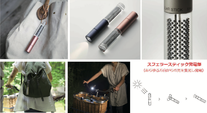 | 作品説明 | <それは光のバトン> 地面から拾い上げた一本の棒。その棒にふしぎなエネルギーを感じたとき、それが道具のはじまりとなりました。 スフェラースティックはそんなプリミティブな棒のかたちをしたソーラーLEDペンライトです。粒々のソーラーで太陽の力をあつめたら、スティックの先から放たれる光のエネルギーを楽しんでください。 |