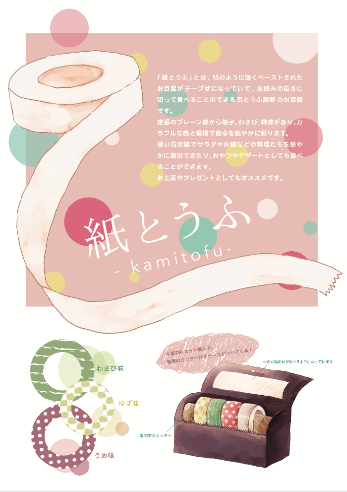 | 作品説明 | 「紙とうふ」は、紙のように薄くペーストされたお豆腐がテープ状になっていて、お好みの長さに切って食べることができるものです。 定番のプレーン味から、柚子、わさび、梅味があり、カラフルな色と模様で食卓を賑やかに彩ることができます。 使い方次第でサラダやお鍋などの料理たちを華やかに演出できたり、おやつやデザートとしても食べることができます。 お土産やプレゼントとしてもオススメです。 |