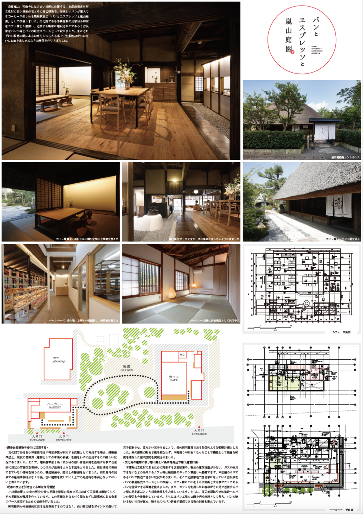 | 作品説明 | 京都嵐山、天龍寺にほど近い場所に位置する、京都府指定有形文化財の旧小林家住宅とその周辺建物を、美味しいパンが購入できコーヒーが楽しめる物販飲食店「パンとエスプレッソと嵐山庭園」として改装した。文化財である茅葺屋根の民家旧小林家をカフェ棟とし整備し、近接する昭和に建設されたであろう古民家をパン工場とパンの販売スペースとして設えた。またそれぞれの敷地の間にあるお庭をしつらえる事で、別敷地ながらお互いにお庭を楽しめるような関係を作り上げた。 |