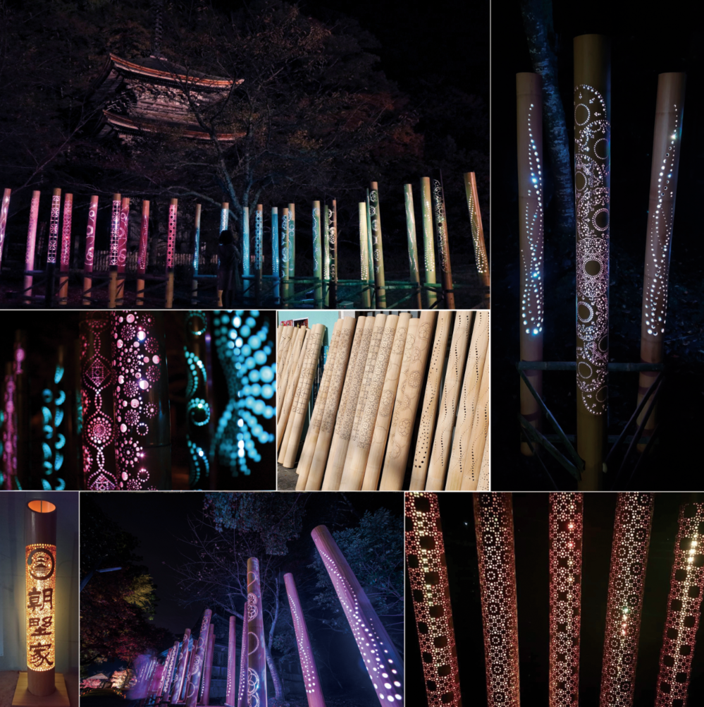 | 作品説明 | 京竹灯り「Kyoto Bamboo Light」は全国的に問題となっている放置竹林の整備で伐採した竹を利活用していて、府下最大の竹林がある舞鶴市内の放置竹林整備で伐採した2、3年物の孟宗竹に10種類以上のサイズが異なる竹専用ドリルでデザインをひとつひとつ手作業で開けています。 これらの「竹灯り」を用いて北近畿を中心に府内外の各地でライトアップイベント等に参加。 京都の竹を用いた幻想的な灯りで多くの人々を魅了し「放置竹林」・「竹害」の周知と理解を得られるようPRし続けています。 |