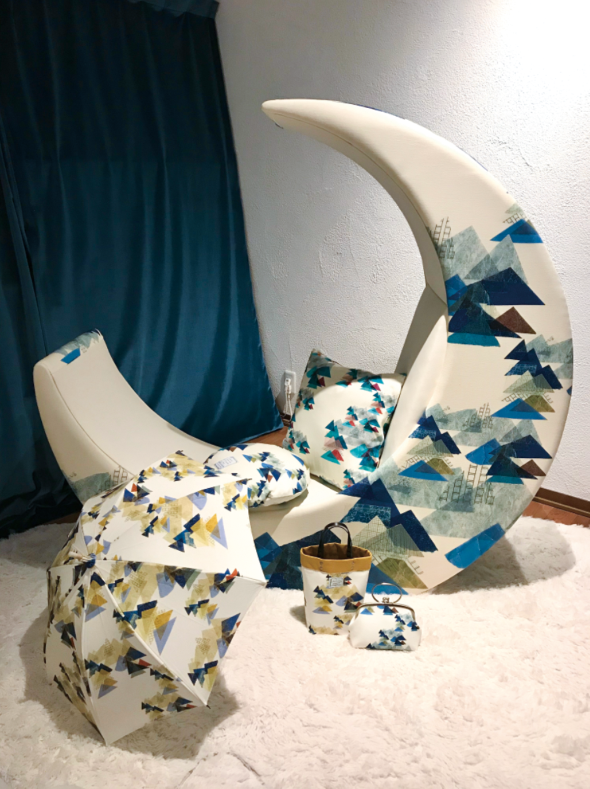 | 作品説明 | 紙のコラージュ作品を元にインクジェットプリントを施したテキスタイルを、京都の様々な職人さんに仕立てていただいています。代表柄は、京都の山並みと鴨川の流れを表した「京の山並み」です。 |