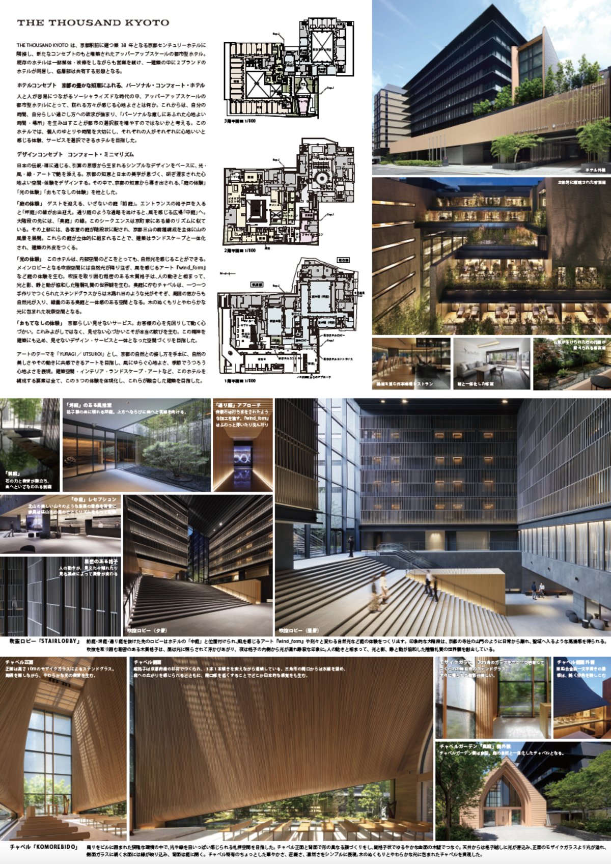 | 作品説明 | 「コンフォート・ミニマリズム」をコンセプトとした京都駅前に建つ都市型ホテル。日本の伝統・禅に通じる、引き算の思想から生まれるシンプルなデザインをベースに、光・風・緑・アートで艶を添える考え方で、日本の美学が息づく、研ぎ澄まされた心地よい空間・体験を生む。建築・インテリア・ランドスケープ・アートなど、このホテルを構成する全ての要素に、京都の知恵から生まれる「庭の体験」「光の体験」が具現化され、それらが融合する建築を目指した。 |