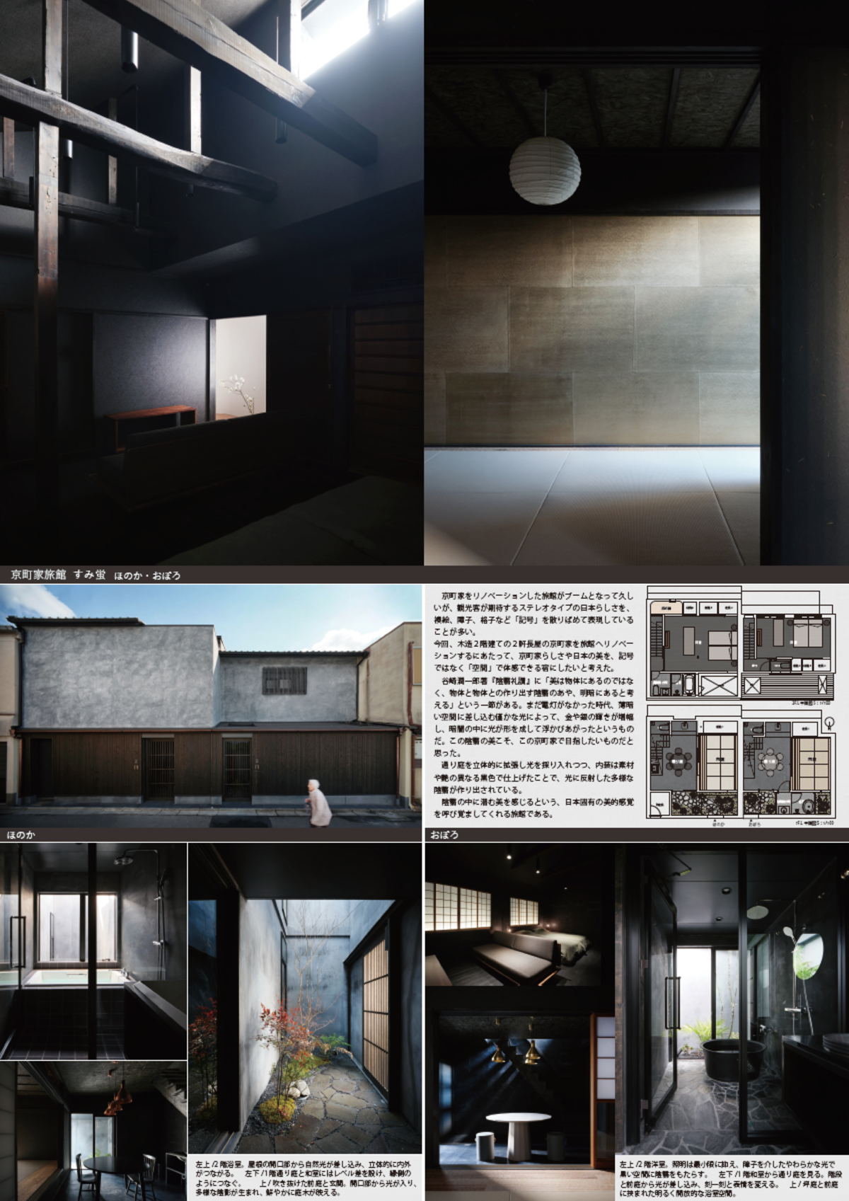 | 作品説明 | 2軒長屋の京町家を改修した2棟の旅館である。谷崎潤一郎著『陰翳礼讃』の一節「美は物体にあるのではなく、物体と物体とのつくり出す陰翳のあや、明暗にあると考える」から着想。通り庭を立体的に拡張し光を採り入れつつ、内装は素材や艶の異なる黒色で仕上げ、光に反射した多様な陰翳、光の濃淡をつくった。陰翳の中に潜む美を感じるという、日本固有の美的感覚を呼び覚ましてくれる宿である。 |