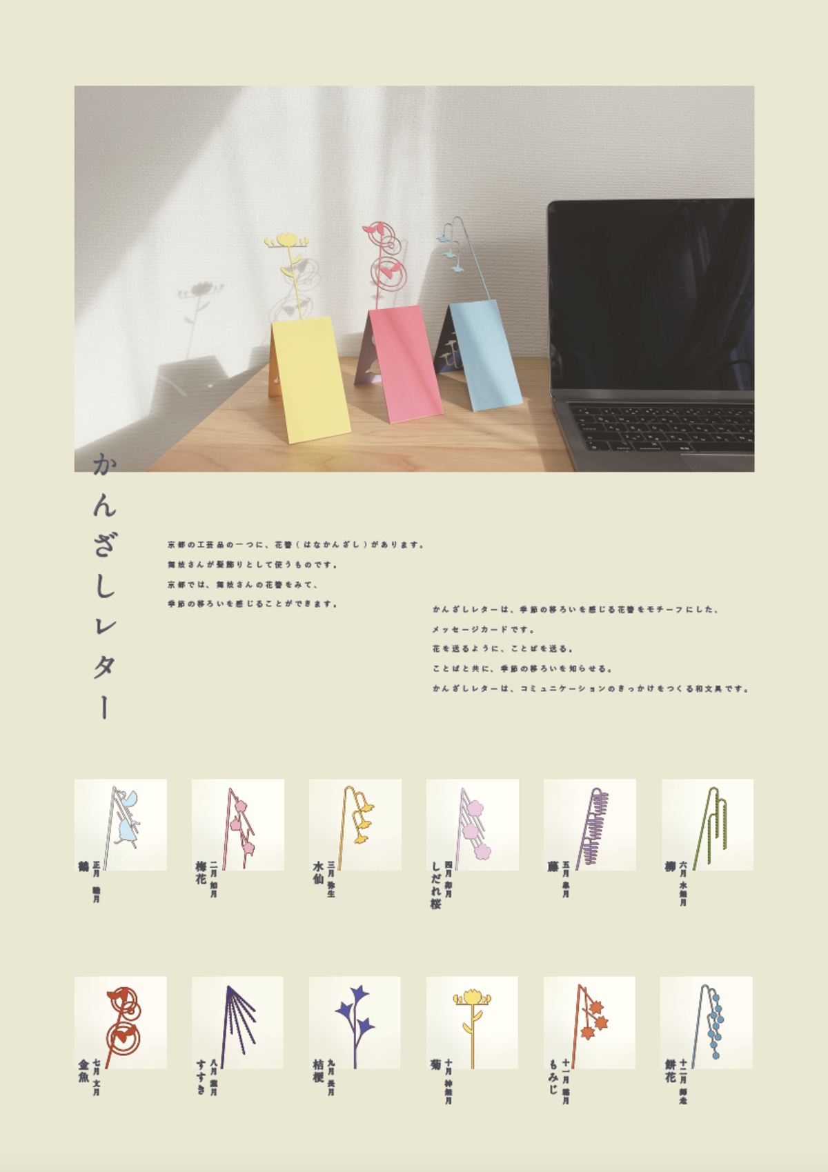 | 作品説明 | 京都の工芸品の一つに、花簪(はなかんざし)があります。 舞妓さんが髪飾りとして使うものです。 京都では、舞妓さんの花簪をみて、 季節の移ろいを感じることができます。かんざしレターは、季節の移ろいを感じる花簪をモチーフにした、 メッセージカードです。 花を送るように、ことばを送る。 ことばと共に、季節の移ろいを知らせる。 かんざしレターは、コミュニケーションのきっかけをつくる和文具です。 |