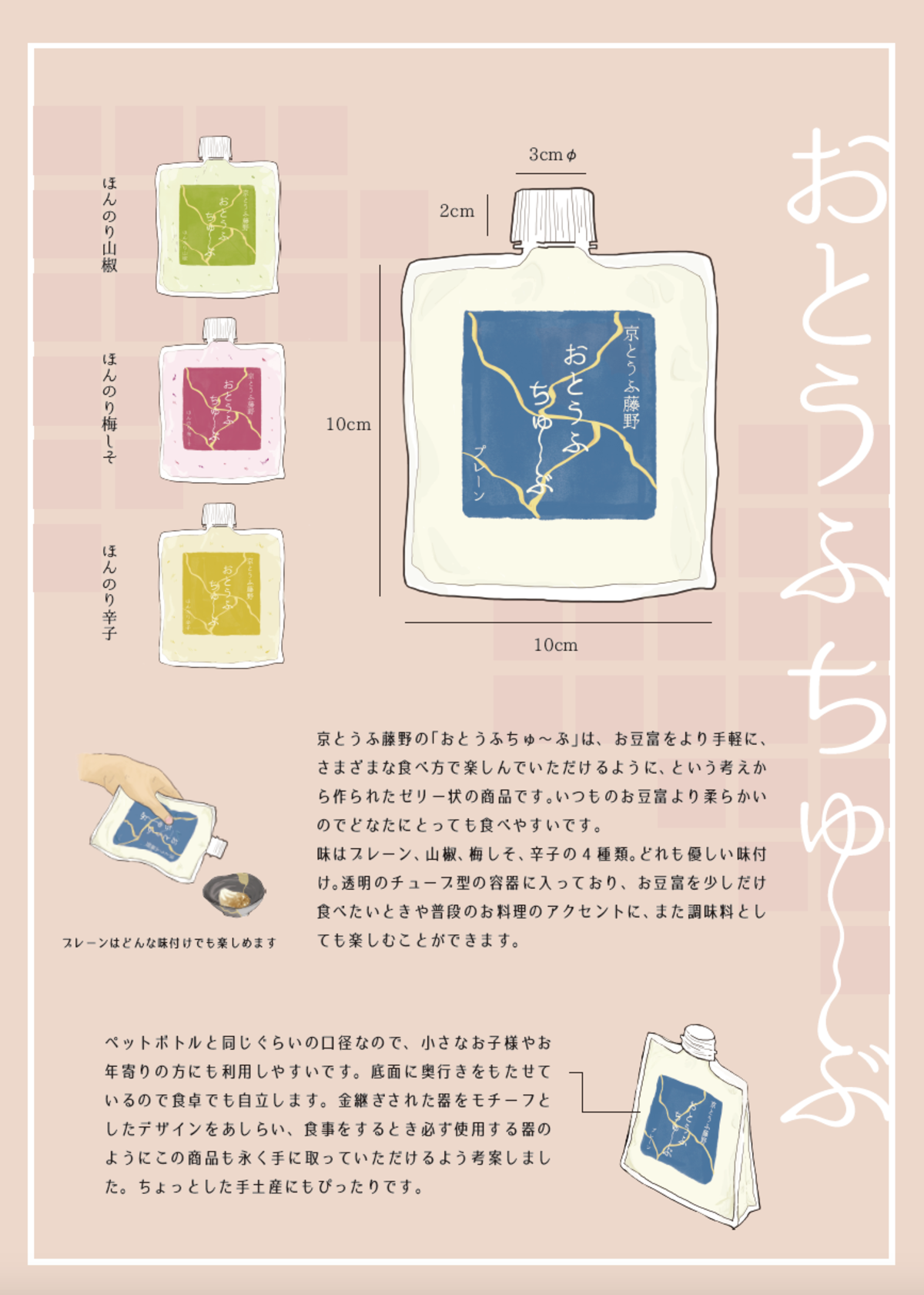 | 作品説明 | 京とうふ藤野の「おとうふちゅ〜ぶ」は、お豆富をより手軽に、さまざまな食べ方で楽しんでいただけるように、という考えから作られたゼリー状の商品です。いつものお豆富より柔らかいのでどなたにとっても食べやすいです。 味はプレーン、山椒、梅しそ、辛子の4種類。どれ も優しい味付け。透明のチューブ型の容器に入っており、お豆富を少しだけ食べたいときや普段のお料理のアクセントに、また調味料としても楽しむことができます。ペットボトルと同じぐらいの口径なので、小さなお子様やお年寄りの方にも利用しやすいです。底面に奥行きをもたせているので食卓でも自立します。金継ぎされた器をモチーフとしたデザインをあしらい、食事をするとき必ず使用する器のようにこの商品も永く手に取っていただけるよう考案しました。ちょっとした手土産にもぴったりです。 |