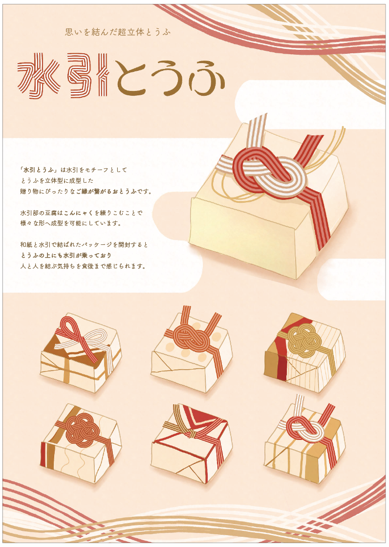 思いを結んだ超立体とうふ 「水引とうふ」は水引をモチーフとして、とうふを立体型に成型した、贈り物にぴったりなご縁が繋がるおとうふです。 水引部の豆腐はこんにゃくを練りこむことで様々な形へ成型を可能にしています。 和紙と水引で結ばれたパッケージを開封すると、とうふの上にも水引が乗っており、人と人を結ぶ気持ちを食後まで感じられます。