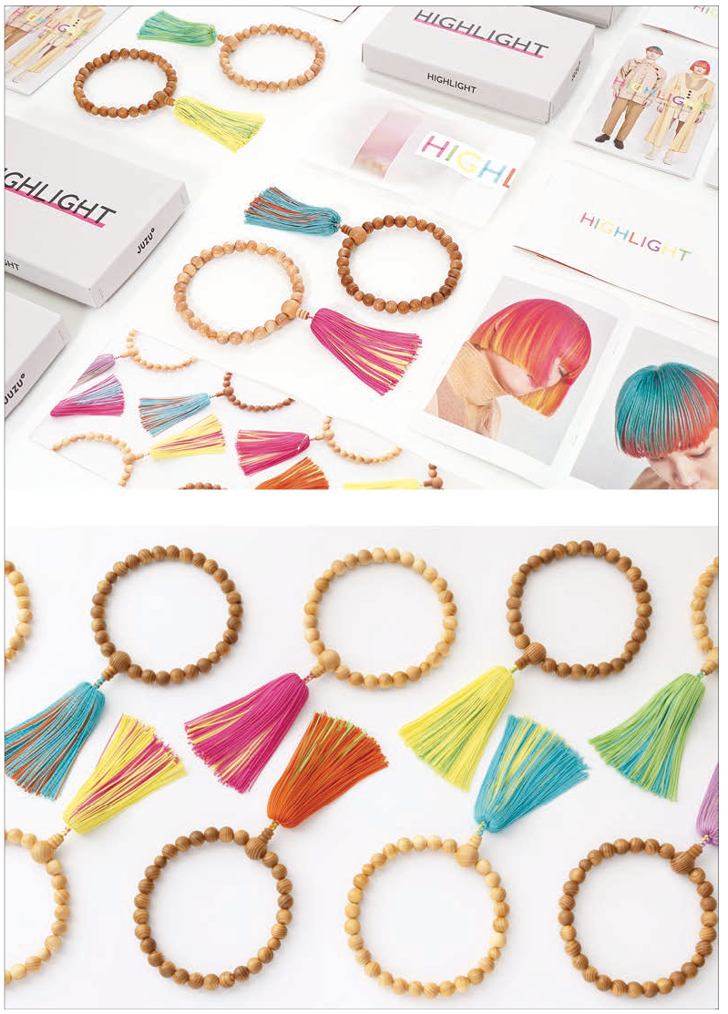 創業300年を迎えた亀井珠数店が、FRUITDROPSとのコラボレーションにより起ち上げたセカンドライン、“次代のJUZUを提案する『JUZU+®』”からの第1弾商品。業界初の房を蛍光染料で染めたジェンダーフリーな京念珠®『HIGHLIGHT(ハイライト)』。 日本では仏前の弔事だけでなく、お願い事をする際に合掌する習慣があります。珠数は想いを伝えるツールです。仏様でも神様へのお願いでも、合わせる手には珠数をかけてほしい。 また、初めて珠数を手にする若年層の“ファースト珠数”となるよう、かわいくPOPな“神仏習合の珠数”として『HIGHLIGHT』はデザインされました。恋愛に憧れる友人や受験生のご子息さま、治療中のクラブ仲間などへの“お守り”としても最適です。 恋愛成就(ピンク×イエロー)、大願成就(ブルー×オレンジ)、病傷平癒(グリーン×ブルー)、合格祈願(イエロー×グリーン)の4種類をご用意しています。