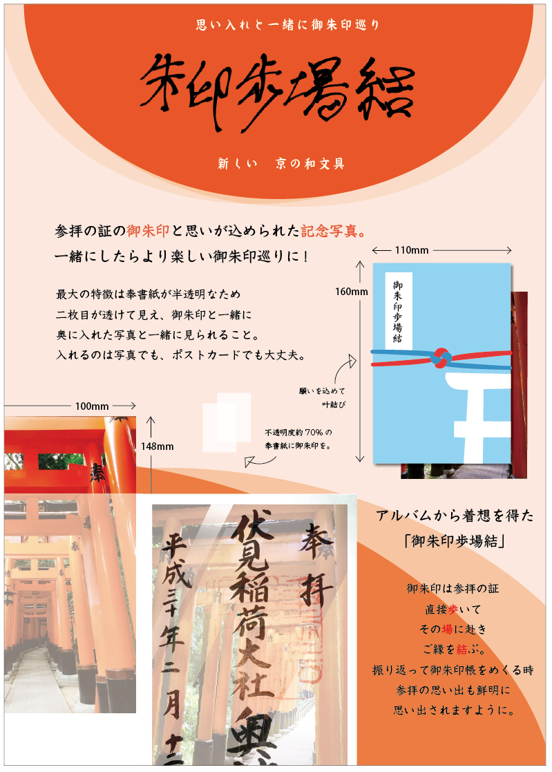 「朱印歩場結」は、アルバムから着想を得た御朱印帳です。御朱印は参拝の証。後に御朱印帳を開く時、より鮮明に参拝やその日の事も思い起こされる、そんな御朱印帳を考えました。半透明の奉書紙を用いることで、二枚目が透け奥に入れた写真と一緒に見ることができます。使いやすいように御朱印帳と写真、ポストカードの一般的なサイズとしています。御朱印帳をとめる紐は、願いごとが叶うようにという意味が込められた、縁起のいい叶結びとし、「朱印歩場結」の文字も、一つ一つに意味を込めて選びました。