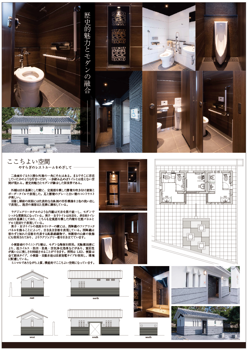 内観は天井を黒で統一し、モダンでシックな雰囲気に。男・女各トイレは木目を、多目的トイレは白を基調とし、内壁は化粧パネルとアルミ見切りで定規筋を表現している。男・女各トイレの洗面カウンター横には、西陣織のファブリックパネルを飾り、祇園祭の山鉾の装飾にも使用されている西陣織は京都を代表する高級絹織物で、よりラグジュアリー感を引き立てています。小便器前のライニングと壁は、意匠性の高い光触媒陶板を採用。抗菌・防汚・防臭などの効果があり、美しさを持続させることができます。LED照明、節水タイプの便器、小便器・自動水栓は自家発電タイプを使用し、環境に配慮している。