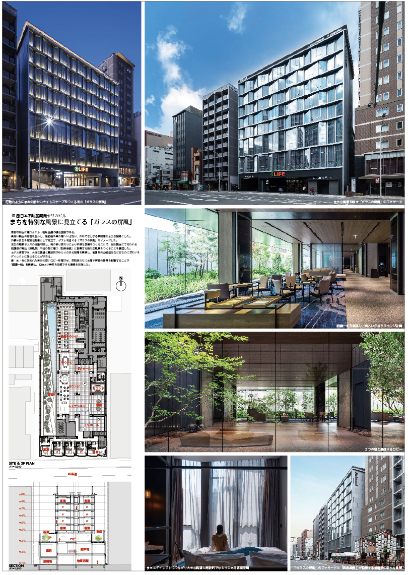 作品説明:京都市街地に建つホテル・物販店舗の複合施設である。 奥深い敷地の特性を生かし、来訪者を奥の間へいざない、おもてなしする京町家のような空間とした。外観はまちを特別な風景として見立て、ゲストを迎える「ガラスの屏風」をイメージした。 まちの風景や人々の活動を映し、時の移り変わりにより多様な表情をつくることで、当計画地にて行われる祇園祭の宵山「屏風祭」や目の前に建つ「四条傘鉾」と協奏する新たな風景をつくることを意図した。