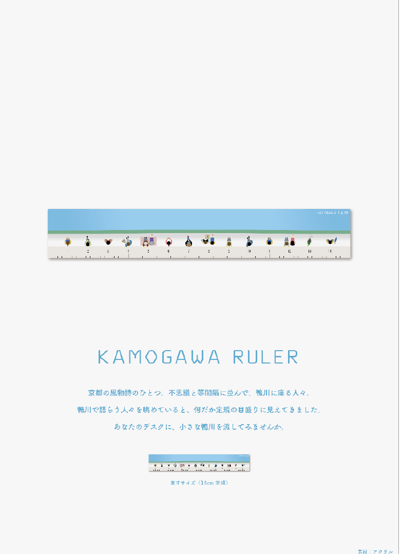 京都の風物詩のひとつ。不思議と等間隔に並んで、鴨川に座る人々。 鴨川で語らう人々を眺めていると、何だか定規の目盛りに見えてきました。 あなたのデスクに、小さな鴨川を流してみませんか。