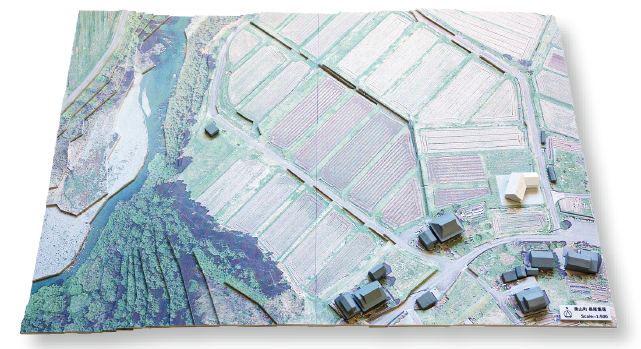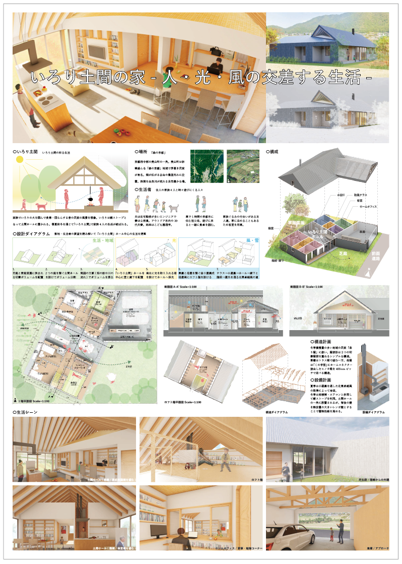 自然豊かな美山町に移住した4人家族のための住宅の計画。 交流の中心として、土足で出入りする「いろり土間」ホールを設ける。家族の生活を彩る様々なアクティビティがホールで結び付く。採光窓や夏季の通風システム・冬季の薪ストーブ利用の蓄熱システムもホールを中心に展開し、この場所の豊かな環境を享受できる住宅とする。夏季は小屋裏を通した北東卓越風の取得によって土間ホールまで風を引き込み冷却する。最高気温が30℃を越えることの少ない地域であり、自然の通風があると十分快適に過ごせる。冬季は薪ストーブを利用する。薪ストーブは土間ホールの一角に設置されるが、ロフト階まで貫通する背後の壁を熱容量の大きいレンガ壁とすることで蓄熱性能を高める。冬季積雪量の多い地域の民家「曲り屋」に倣い、屋根形は2つの切妻屋根を重ねるシンプルな構造として形をまとめる。