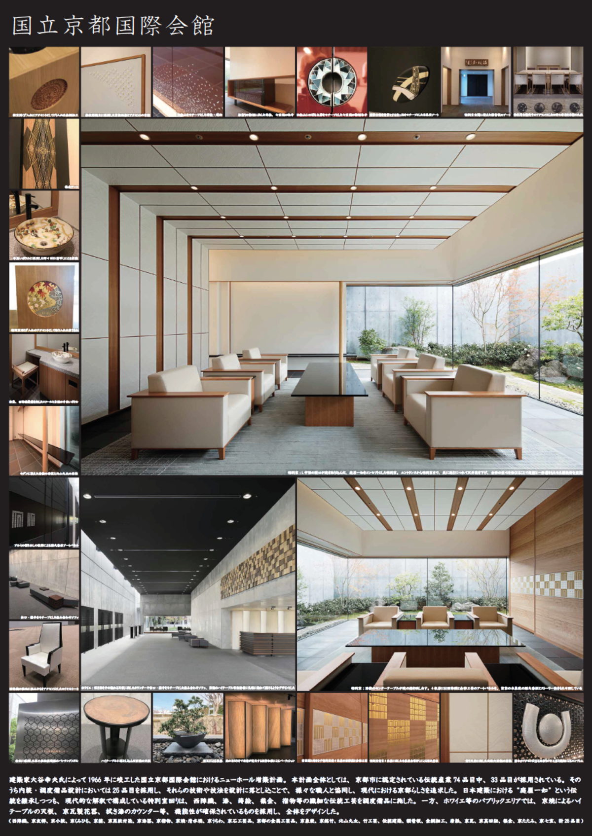 | 作品説明 | 建築家大谷幸夫氏によって1966 年に竣工した国立京都国際会館におけるニューホール増築計画。本計画全体としては、京都市に認定されている伝統産業74品目中、33品目が採用されている。そのうち内装・調度備品設計においては25品目を採用し、それらの技術や技法を設計に落とし込むことで、様々な職人と協同し、現代における京都らしさを追求した。日本建築における“庭屋一如”という伝統を継承しつつも、現代的な解釈で構成している特別室回りは、西陣織、漆、蒔絵、截金、指物等の繊細な伝統工芸を調度備品に施した。一方、ホワイエ等のパブリックエリアでは、京焼によるハイテーブルの天板、京瓦製花器、拭き漆のカウンター等、機能性が確保されているものを採用し、全体をデザインした。(西陣織、京友禅、京小紋、京くみひも、京繍、京黒紋付染、京漆器、京指物、京焼・清水焼、京うちわ、京石工芸品、京都の金属工芸品、京象嵌、京銘竹、北山丸太、竹工芸、伝統建築、額看板、金網細工、唐紙、京瓦、京真田紐、截金、京たたみ、京七宝、計25品目) |