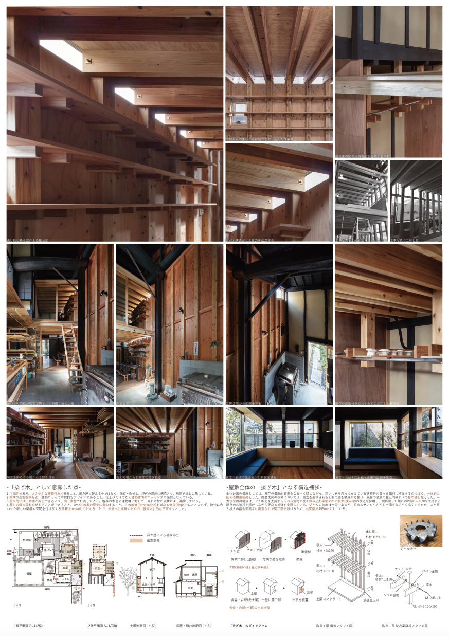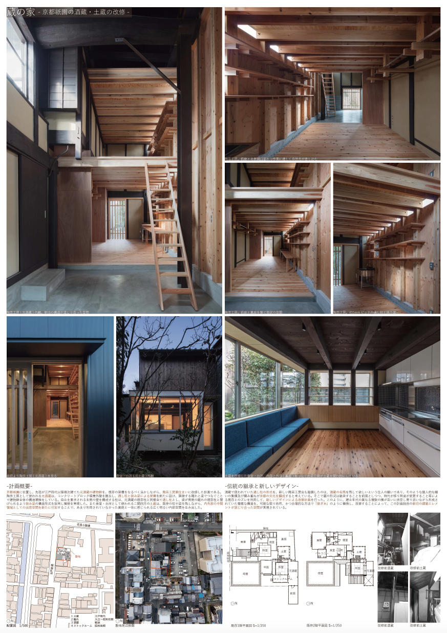 | 作品説明 | 京都祇園に位置し、江戸時代以降の元酒蔵の建物群を、既存の架構をなるべく活かしながら、陶芸工房兼住宅に改修した計画である。 陶芸工房として使われる元酒蔵は、倒壊寸前であったコンクリートブロック塀兼外壁を更新し、隣接する離れとつなぐことで建物群全体の構造補強をしている。自立を要求される北側の壁を構成する柱は、元酒蔵の既存柱と同様全て「通し柱」とし、梁が南側の離れの既存構造と繋げられるようジベル金物による「挟み梁」の構造形式を採用し補強を実現した。また食堂・台所として使われる二間四方の土蔵は、既存の柱や梁を残しながら、内外部の中間領域としての出窓空間を新たに付加することで、裏庭と一体に感じられる広く明るい内部空間を生み出した。建立年代の異なる複数の棟が互いに依存し寄り添いながら形成されていた複雑な構造を、可能な限り自然、かつ合理的な方法で「接ぎ木」のように補強し改修した。 |
