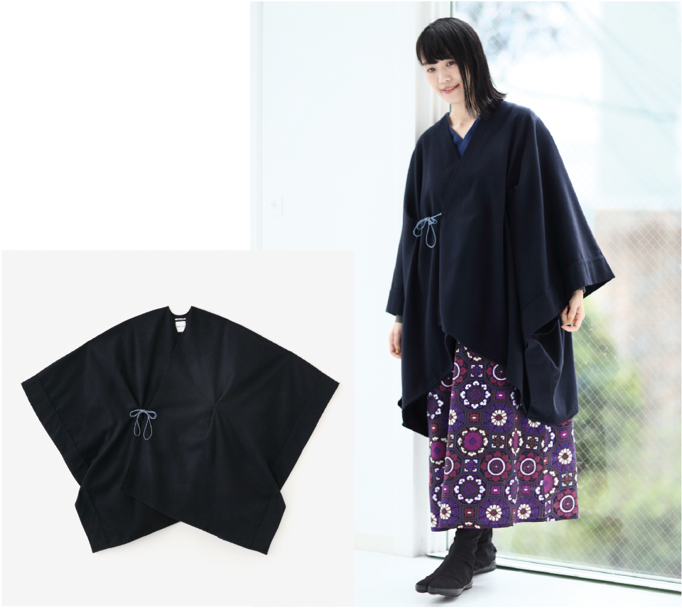 | 作品説明 | 少し肌寒い季節に「着物の上に更(さら)に着(き)る」という意味の「きさらぎ」という言葉から名付けた羽織。150センチの生地巾をそのまま生かし、生地を余すところなく使用した無駄のないデザインが特徴。 |