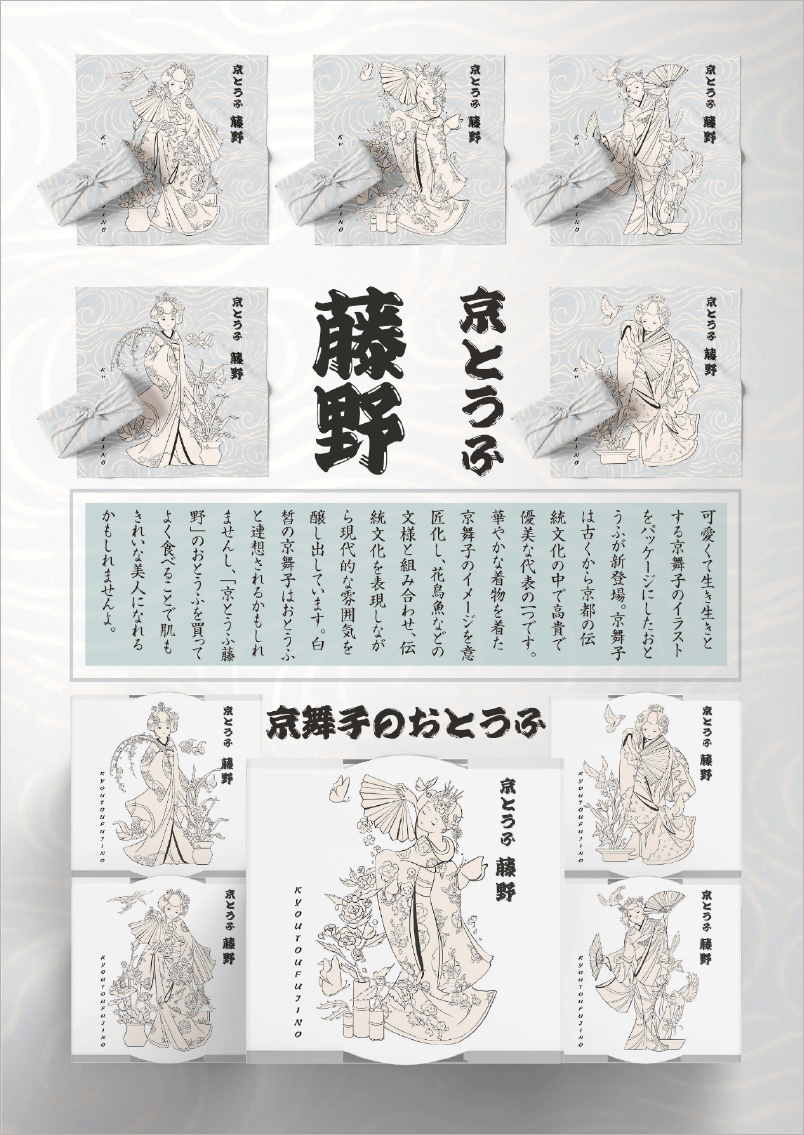 作品説明 | 京舞子は古くから京都の伝統文化の中に高貴で優美な体表の一つであると思います。本デザインは、華やかな着物を着た京舞子のイメージを意匠化し、花・鳥・魚などの文様と組み合わせ、伝統文化を表現しながら現代的な雰囲気を醸し出しています。外層のパッケージは風呂敷を使用し、伝統的なイメージまた心遣いを感じさせます。内層のパッケージは紙箱で、二つを組になって風呂敷に包まれて販売されています。美味しいお豆腐を食べた後、風呂敷はリサイクルできるので、環境にも優しいと思います。 |