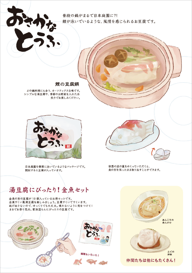 作品説明 | 「おさかなとうふ」は、その名の通り魚の形をしているお豆腐です。 まるで魚が泳いでいるかのようなお鍋の中は、日本庭園そのもの。 近頃は様々な事情で、家庭の中にも笑顔が少なくなっていると思います。 この「おさかなとうふ」で食卓を彩り、楽しく食事をしていただきたいという想いで制作しました。 |