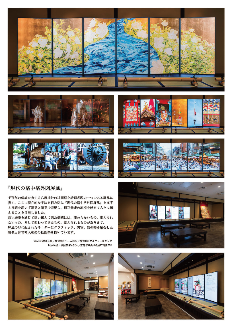 | 作品説明 | 千百年の伝統を有する八坂神社の祭礼『祇園祭』を相互伝達の垣根を越えて人々に伝えることを目指し、文字と言語を用いず視覚と聴覚で表現しました。「変わらないもの、変えられないもの」そして「変わってきたもの、変えられるもの」があります。日本の伝統的な絵画表現の一つである「屏風」に祇園祭を描く、ここに現在的な手法を組み込み「現代の洛中洛外図屏風」を制作いたしました。屏風の形に配されたモニターにグラフィック、実写、能の舞を融合した映像と音で神人和楽の祇園祭を描いています。 |