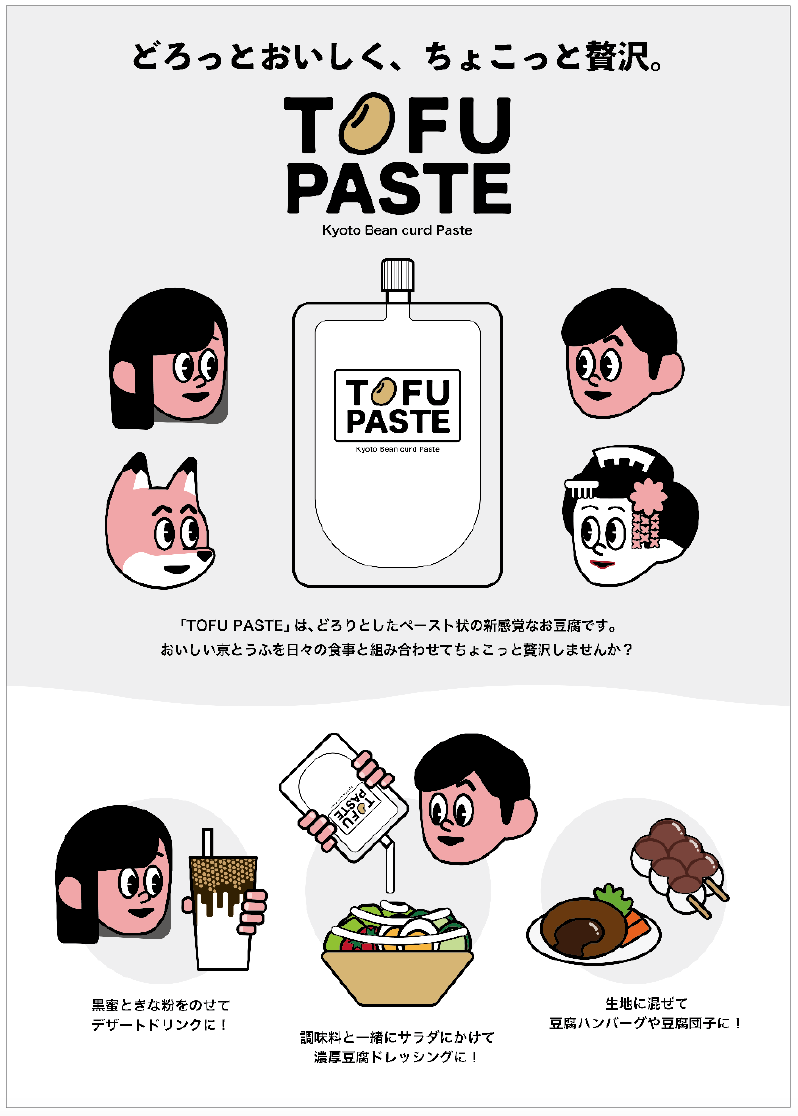 TOFU PASTEは、どろりとしたペースト状の新感覚なお豆腐です。サラダにかけてドレッシングに、黒蜜ときな粉をかけてデザートドリンクに、生地に混ぜて豆腐ハンバーグや豆腐団子にするなど、可能性は無限大!美味しい京とうふを日々の食事と組み合わせてちょこっと贅沢しませんか?