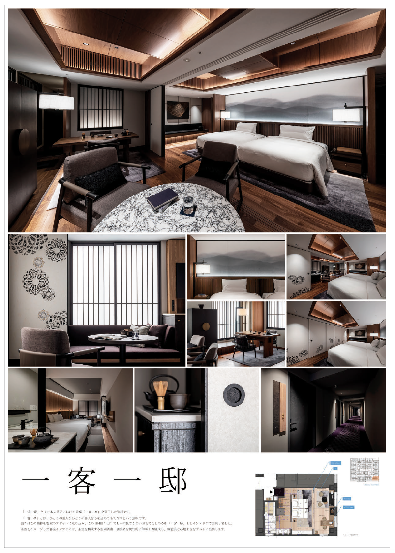 <インテリアデザイン> 日本の茶道における言葉、一人の主人が一人の客人に対して心を込めてもてなすという意味の「一客一亭」の精神をデザインに採り込んだ造語「一客一邸」をコンセプトとした。 茶室を構成する格子や畳、襖といった空間要素、掛け軸や茶道具などの調度品を現代的に解釈して再構成したインテリアデザインは、凛とした空気感を生み出しつつゲストへ心地の良い特別な体験を届ける。