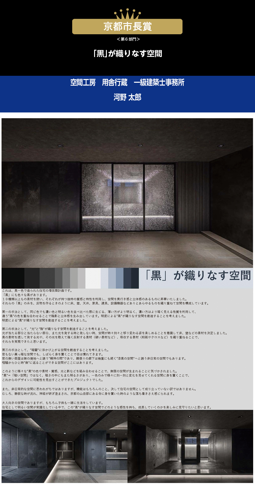 世界中のマテリアルから厳選した15以上の材料と20以上の黒色を使用して空間を構成しています。