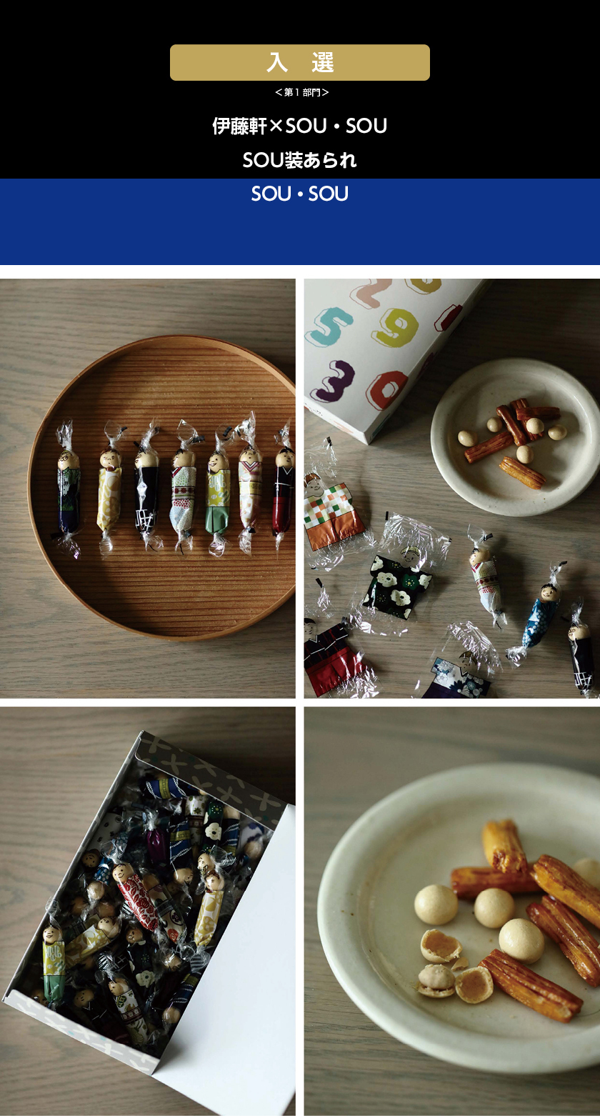 1864年創業の京都の老舗和菓子メーカー「伊藤軒」とのコラボレーション。昔からあるコケシ包装のあられをリニューアル。SOU・SOUの装い(=SOU装)のあられに仕上げました。なつかしくも新しい“わらべ菓子”です。全24柄。