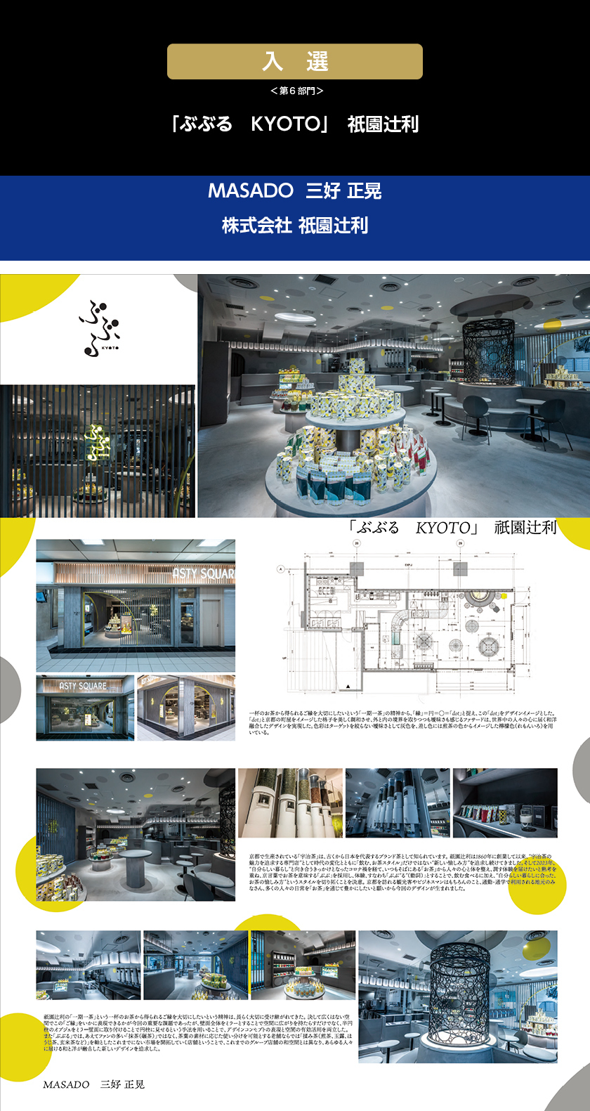 一杯のお茶から得られるご縁を大切にしたいという「一期一茶」の精神から、「縁」=円=0=「dot」と捉え、この「dot」をデザインイメ ージとしました。 「dot」と京都の町屋をイメ ージした格子を美しく調和させ、外と内の境界を取りつつも曖昧さも感じるファサードは、世界中の人々の心に届く和洋融合したデザインを目指しました。色彩はターゲットを絞らない曖昧さとして灰色を、差し色には煎茶の色からイメージした檸檬色(れもんいろ)を用いています。また、祇園辻利3つ目のブランドという意味での3と、世界にお茶を広げたいという思いから世界六大陸の6の2つの数字が茶缶のアイアンアートに隠されており、6種類のdotに各壁面・天井面に3つずつ檸檬色のdotを設け、ユニフォームやパッケージも含めトータルでのデザインを考えました。他、床には星型の真鍮を埋め込みスターになれる様に願いを込めています。