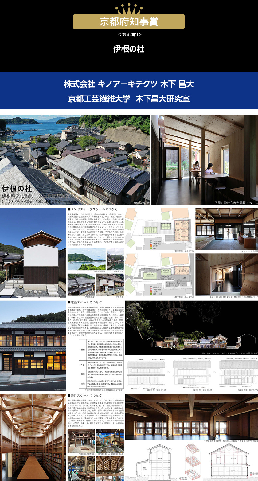 京都北東部の伊根町で、町民が寄贈した重要伝統的建造物群保存地区内の民家を、図書館へ再生した。伊根の民家は、海に面する舟屋、山裾に並ぶ蔵、その中間にある主屋で構成される。改修対象は主屋だったため、本のための蔵を2棟増築し、町並に溶け込ませた。本の蔵はその奥にある既存の蔵と連なり、伊根固有の風景を敷地に引き込み、かつての生活道路を子どもが通り抜ける賑やかな里道へと甦らせた。建築の外観は、重要伝統的建造物で求められるファサードの復元と、現代のスペックを照らし合わせ最適化。建設当初と一致しないが、建造物「群」の保存とは風景の保存である。皆が思い描く心象風景を再現することが重要であり、建物の雰囲気を保ちながら時代ごとに更新していくことに意味がある。観光資源の舟屋のみならず、主屋と蔵がつくる集落構造、それらと共にある生活像を更新しながら持続させることこそ、伊根町の本質的な持続可能性につながるはずだ。