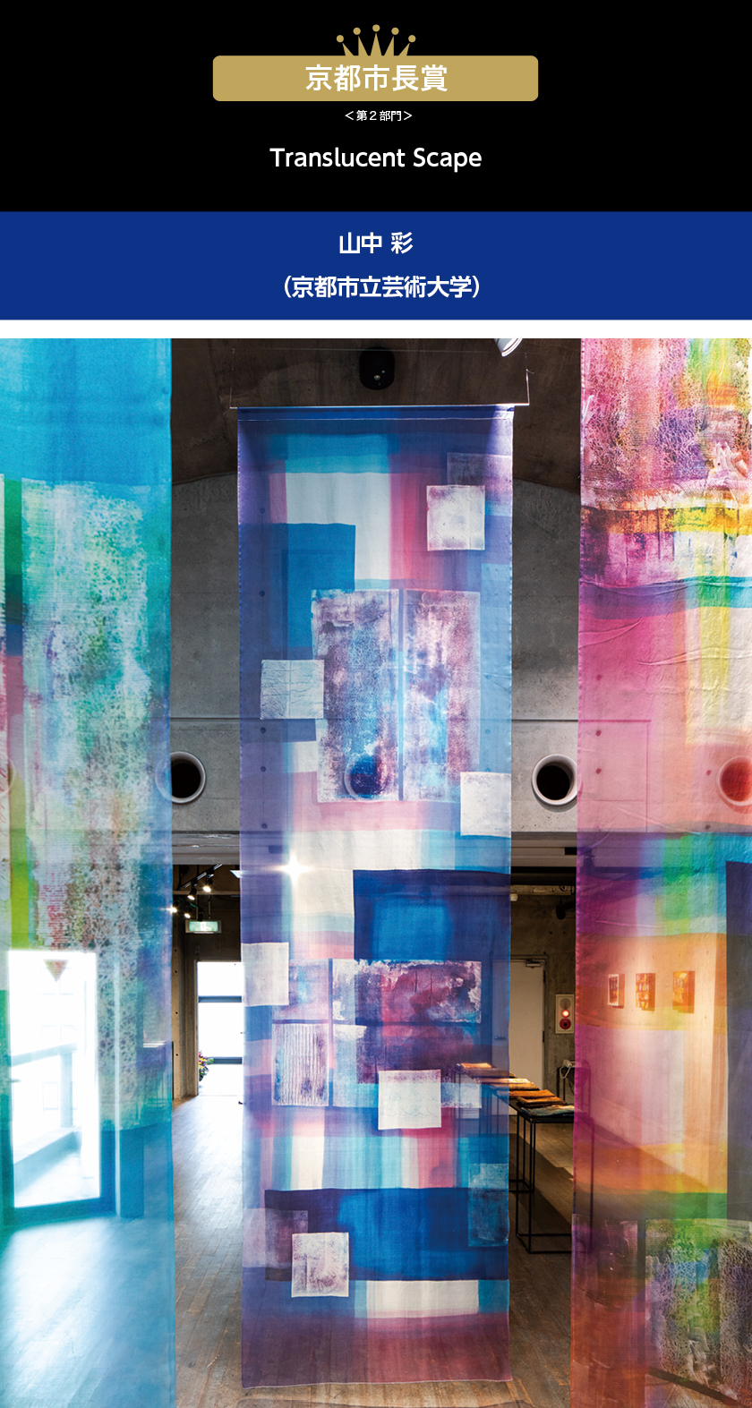柿渋や友禅染めなど、古くから親しまれてきた染色文化を現代の生活に取り入れるインテリアファブリック。カフェやショップ等の人が行き交う公共空間を、季節やイベント等のシーンに合わせて華やかに演出したり、日常の風景に新しい視点を与えることができます。風にゆれるモビールとして空間に動きを与えながら、軽やかで自然な動線をつくり、隣合う人やテーブルとのゆるやかな間仕切りとしての役目も果たすことができます。