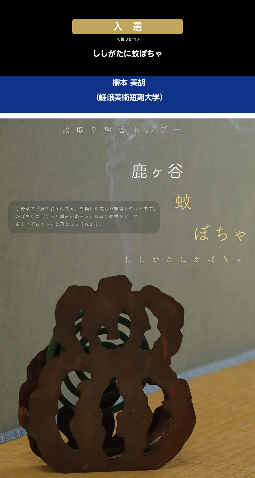 京野菜の「鹿ケ谷かぼちゃ」を模した蚊取り線香スタンドです。かぼちゃのぼてっと重みのあるフォルムで線香を支えて、蚊を「ぼちゃっ」と落としてくれます。 はじめに 講評 入賞 大賞 大賞 京都府知事賞 京都市長賞 京都商工会議所会頭賞 京都新聞賞 伏見の清酒・都鶴賞 京とうふ藤野賞 京の和文具賞 くろちく賞 KeDDii ALPHA賞 学生賞(画箋堂賞) 入選 Order かさねる京都府マップ Gaitta よなぬき 革帯 おみな アルミの組子ランプ miko counter chair 扇暖簾(おうぎのれん) ししがたに蚊ぼちゃ 撫牛しおり 都鶴 都鶴 お抹茶豆腐 友禅模様アニメーション 出水の家 越後町の家 -路地を抜く家- 武者小路町の共同住宅 後援・協力・協賛 入賞・入選者一覧