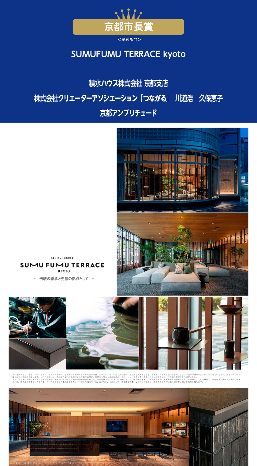 SUMUFUMU TERRACE KYOTO は京都の中心部にあり、多くの人目に触れる立地にあります。周辺は街に閉ざしたビル群が建並ぶクローズの空間でしたが、情報発信基地としてこの施設は外部に開けた空間になるよう計画しました。新しいものと古いものが共存し再生、発展をしている京都で街並みを意識しながら、色気や温もり、落ち着き感のある空間をベースに、京都が積み重ねてきた時間の深みを取り込みたいと考えました。内部構成は大きく3つに分けて計画しました。入口付近にある多目的に使えるゆったりとしたラウンジ空間は壁面全周に格子を配し、嵐山の竹林をイメージさせるような非日常的な印象を与えます。視線を和らげながら外との境界をつくる格子は、好奇心を掻き立てる仕掛けとなります。中央に計画したソファやプランターは移動式とし、人数に合わせて多目的に活用できる空間としています。施設中央に位置するインヴィテーションスペースは受付としてロングカウンターを設け打ち合わせやセミナーの場として様々な説明の場になるような空間構成にしています。企業の顔となる場所になるため、カウンターとテーブルは高さを揃え、水平ラインを強調したデザインにしています。テーブルの素材や装飾のタイルは特別なものを選び、この施設の中心として考えました。施設一番奥にはプライベートラウンジを設け、大型モニターを設置して上質な空間を体感できる場所としました。京都ならではの素材を活かす事を意識し、西陣織や織物クロスを取り込いれて伝統工芸と空間を一体的に提案をしました。外部に対して列柱の連続感を出すことで、奥行き感を持たせ、施設全体が細長く、全てのスペースが開口部に面しているので、屋外との緩衝帯として植栽を設け街路樹とリンクされることで、外と中を曖昧にして、街との繋がりを生み出しました。この場所が世界一幸せな「わが家」づくりの始るきっかけとして訪れて欲しい場所になってもらえる事を願い設計しました。