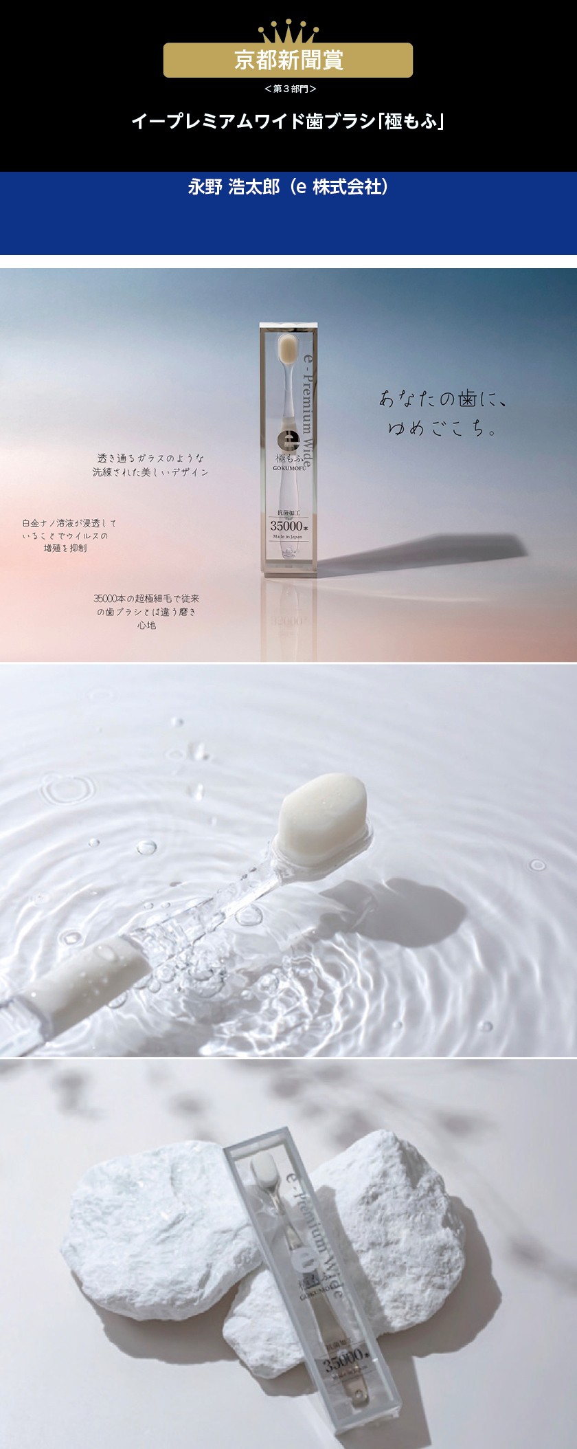 あなたの歯に、ゆめごこち。透き通るガラスのような洗練された美しいデザイン白金ナノ溶液が浸透していることでウイルスの増殖を抑制35000本の超極細毛で従来の歯ブラシとは違う磨き心地 はじめに 講評 入賞 大賞 大賞 京都府知事賞 京都市長賞 京都商工会議所会頭賞 京都新聞賞 伏見の清酒・都鶴賞 京とうふ藤野賞 京の和文具賞 くろちく賞 KeDDii ALPHA賞 学生賞(画箋堂賞) 入選 Order かさねる京都府マップ Gaitta よなぬき 革帯 おみな アルミの組子ランプ miko counter chair 扇暖簾(おうぎのれん) ししがたに蚊ぼちゃ 撫牛しおり 都鶴 都鶴 お抹茶豆腐 友禅模様アニメーション 出水の家 越後町の家 -路地を抜く家- 武者小路町の共同住宅 後援・協力・協賛 入賞・入選者一覧